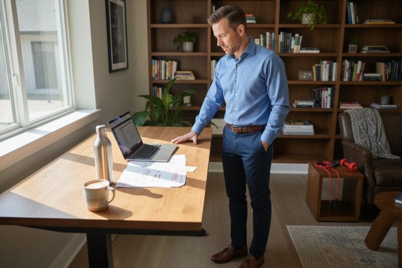 Standing desk intervals: Alternating between sitting and standing every 30 to 45 minutes breaks the cycle of sustained perineal compression without requiring any formal exercise.