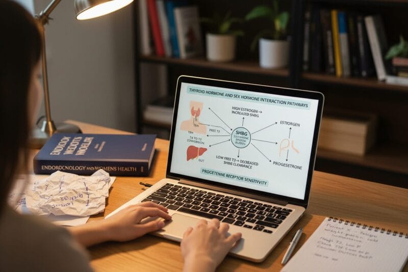 What makes this especially relevant for women is the relationship between thyroid hormones and sex hormones. Thyroid dysfunction raises levels of sex hormone-binding globulin (SHBG), a protein that binds to estrogen and testosterone and makes them less available for the body to use. When SHBG is elevated due to low thyroid function, free estrogen and testosterone drop, even when total hormone levels appear normal on a basic blood panel.